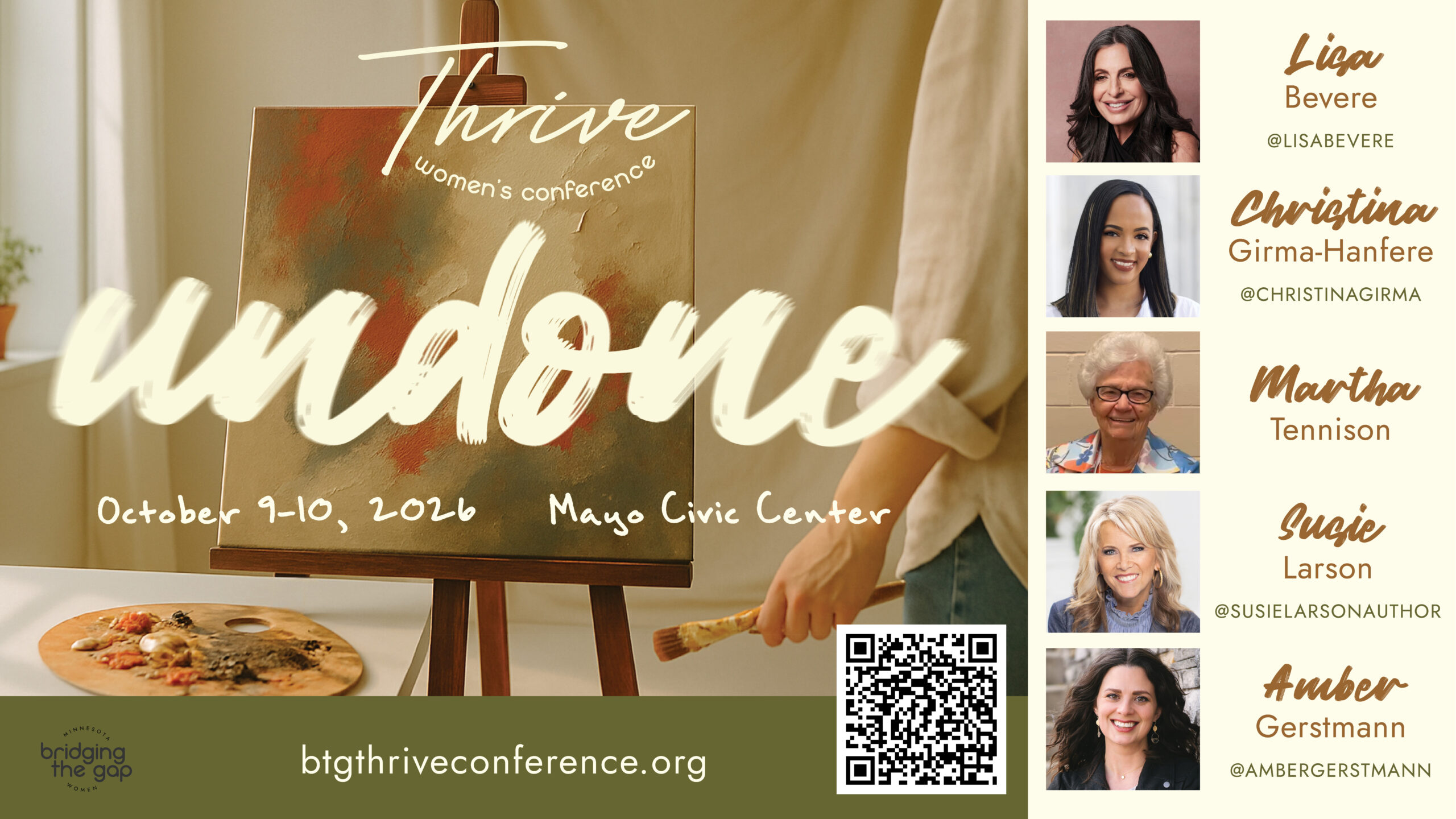 - Lunch with Speakers (Lisa Bevere, Christina Girma-Hanfere, Martha Tennison, and Susie Larson; Rochester Art Center; optional add-on; limited space!)